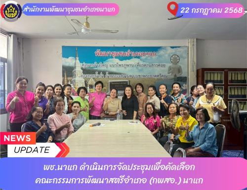 นางสาวงามตา ยืนยง พัฒนาการอำเภอนาแก พร้อมด้วยเจ้าหน้าที่พัฒนาชุมชน ดำเนินการจัดประชุมเพื่อคัดเลือกคณะกรรมการพัฒนาสตรีอำเภอ (กพสอ.) นาแก โดยมีผู้แทนจากคณะกรรมการพัฒนาสตรีตำบล (กพสต.) 12 ตำบล ละ 2 คน ประกอบด้วย ประธาน และกรรมการ รวม 24 คน และสตรีผู้ทำประโยชน์ในด้านการพัฒนาสตรีของอำเภอจำนวน 5 คน รวม 29 คน ร่วมประชุม โดยดำเนินการดังนี้